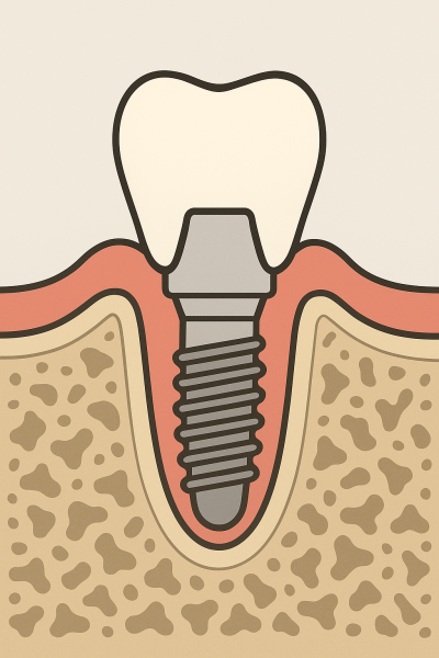 Un implant dentaire est un dispositif destiné à remplacer la racine d'une dent. Réalisé en titane ou en zircone (matériaux biocompatibles), en forme de vis cylindro-conique et mesurant entre 6 et 15 mm, l'implant est inséré directement dans l'os de la mâchoire.